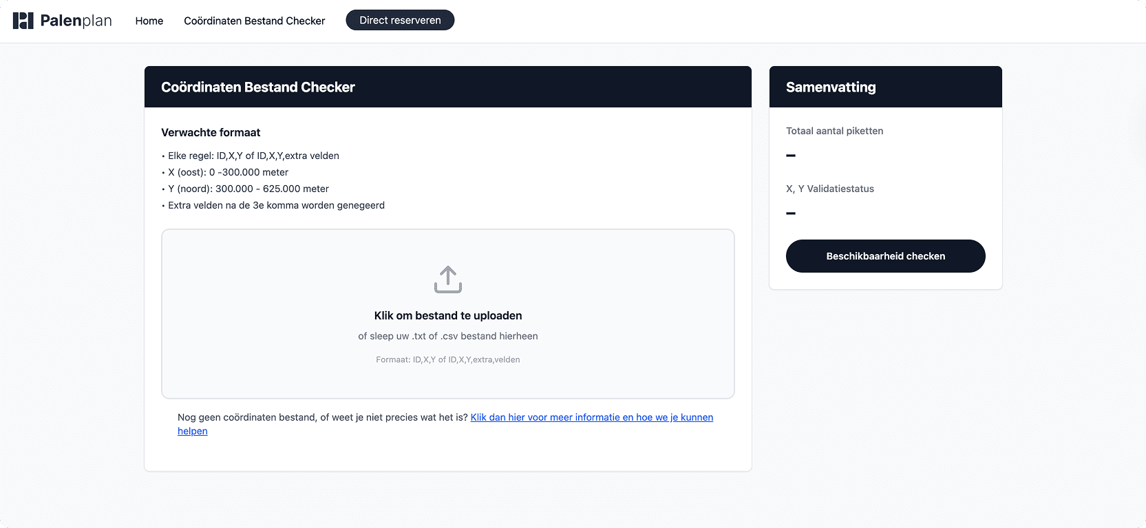 Doe daarom eerst de 3-minuten pre-check als je wil begrijpen wat je aanlevert, en upload daarna direct in de Coördinaten Bestand Checker als je zekerheid wil. Zeker als je ons wil inhuren is dat uploadmoment sowieso onderdeel van het formulier, dus hoe eerder je het doet, hoe sneller je door bent.